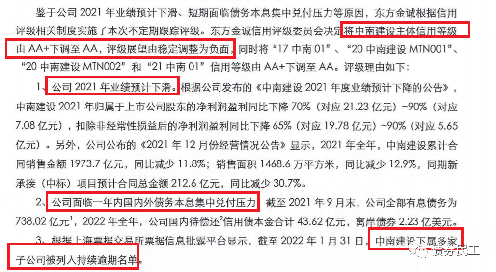 此前的2022年2月24日,東方金誠披露了《關(guān)于下調(diào)江蘇中南建設(shè)集團股份有限公司主體及相關(guān)債項信用等級的公告》,將中南建設(shè)的主體信用等級由AA+下調(diào)至AA,并將評級展望調(diào)整為負(fù)面。本次評級下調(diào)的主要原因是公司2021年業(yè)績預(yù)計下滑、面臨集中兌付壓力、子公司被列入票交所逾期名單等。