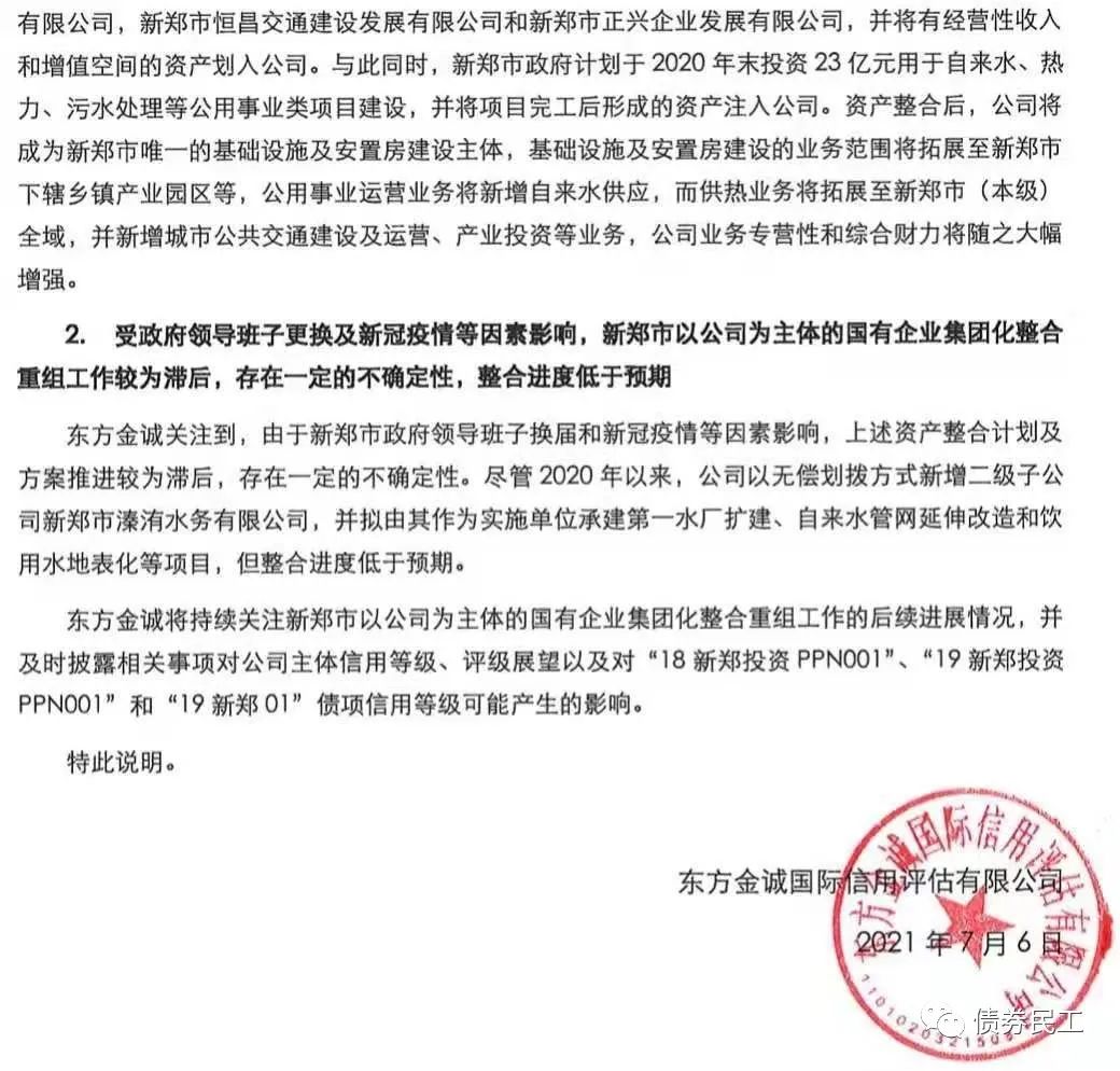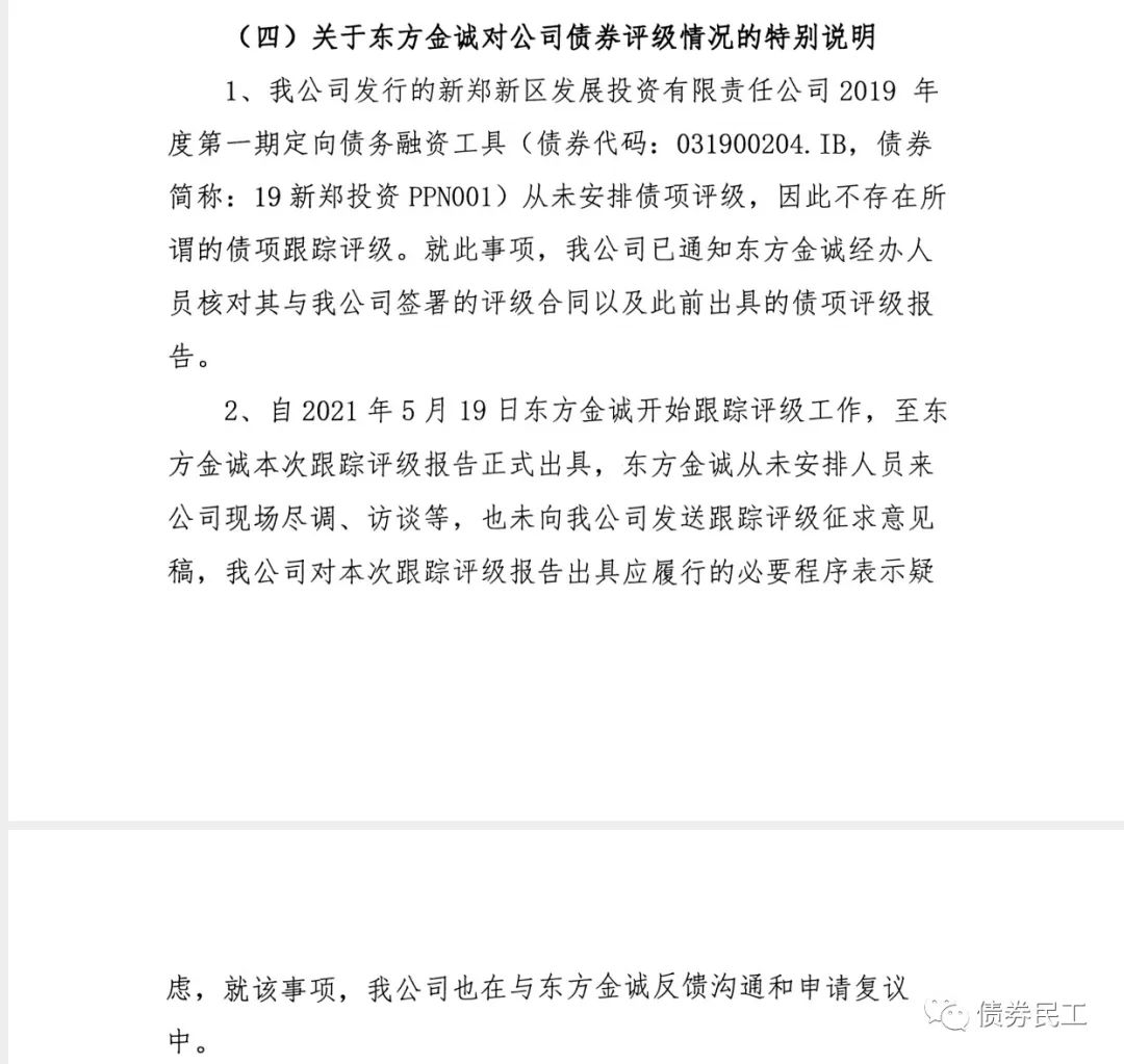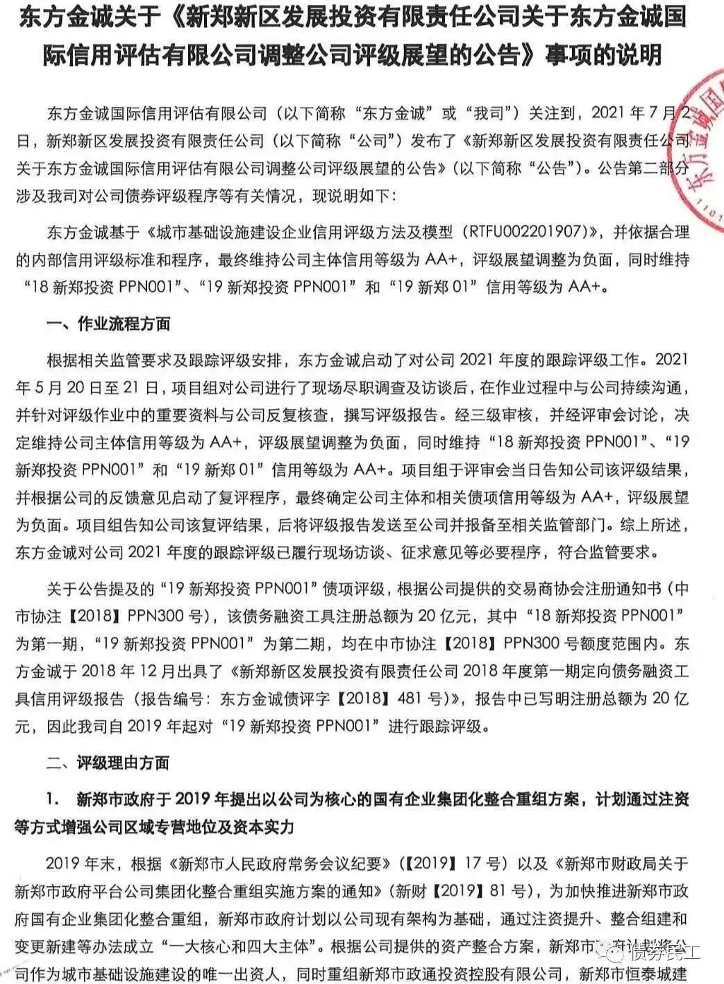 2021年6月29日,東方金誠的跟蹤評級報告評定新鄭新區(qū)發(fā)展投資有限責(zé)任公司(以下簡稱“新鄭投資”)發(fā)行的“18新鄭投資PPN001”和“19新鄭投資PPN001”的主體評級為AA+,評級展望由穩(wěn)定調(diào)整為負(fù)面。新鄭投資在2021年7月2日發(fā)布了《關(guān)于東方金誠國際信用評估有限公司調(diào)整公司評級展望的公告》,明確申明了兩個特別說明:一是新鄭投資認(rèn)為 “19新鄭投資PPN001”未做債項評級安排;二是新鄭投資認(rèn)為東方金誠跟蹤評級未進行現(xiàn)場盡調(diào)訪談、也未征求公司意見,評級報告出具未履行必要流程,正在申請復(fù)議中。
