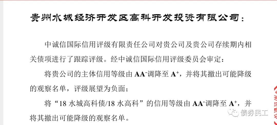 2020年12月17日,中誠信國際將貴州水城經(jīng)濟開發(fā)區(qū)高科開發(fā)投資有限公司(以下簡稱“貴州水城經(jīng)投”)主體信用等級由AA調(diào)降至AA-,并繼續(xù)列入可能降低的觀察名單。
