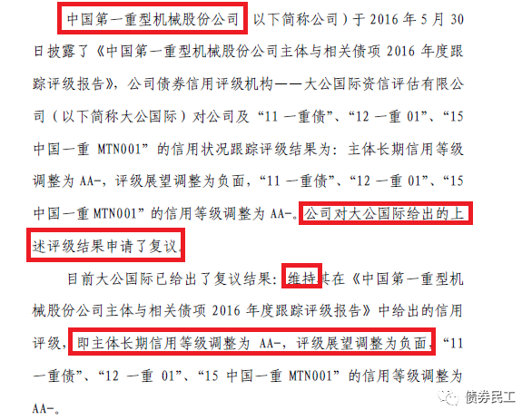 從實踐來看,信用債券市場上發(fā)行人對于評級機構(gòu)的評級結(jié)果公開提出異議的情況并不多。債券民工印象中比較深的發(fā)行人對信用評級就結(jié)果公開提出異議并進行復(fù)議的是中國第一重型機械股份公司在2016年對評級結(jié)果提出了異議并進行復(fù)議,但是復(fù)議結(jié)果還是維持了主體長期信用等級為AA-,評級展望調(diào)整為負(fù)面的結(jié)果。