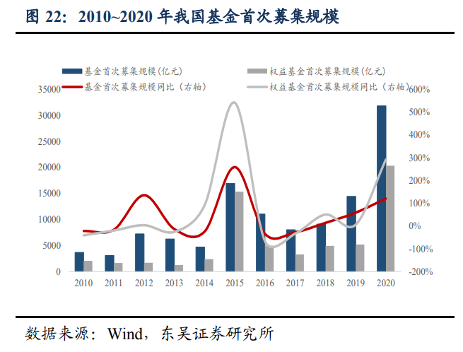 2015年,我國基金首次募集規模較2014年暴增,是2014年3倍多。可那一年透支了居民幾年的基金購買力,而牛市后的狂跌也讓基民幾年后才解套,直到2020年才重拾對基金的信念。