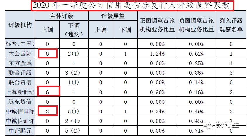 同期對(duì)比來看,僅在2020年第一季度,主體評(píng)級(jí)上調(diào)的發(fā)行人數(shù)量就已經(jīng)有15家,主體評(píng)級(jí)下調(diào)的發(fā)行人數(shù)量為13家,監(jiān)管新規(guī)之后的對(duì)比數(shù)據(jù)還是很明顯的。