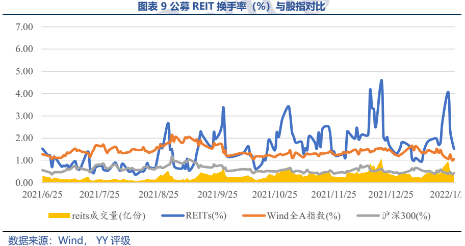 首批9個公募REITs發行上市已7個月,資產類型為產業園區、倉儲物流、生態環保、高速公路。(1)從發行情況看,流動盤占比相對較少,占總份額的40%;產品受到投資者積極的認購,網下平均配售率為14.51%,公眾投資配售率平均為6.27%。(2)二級市場走勢“先抑后揚”,收益率與股票、債券相關度小;日均換手率在1.5%左右,遠高于美國REIT市場的0.7%水平,短線交易明顯。(3)從后續經營情況看,除倉儲物流依舊表現優秀外,其他類型資產第四季度的收入水平都要劣于第三季度。總體來看,投資者持有的收益還是主要來自二級市場上的增值,“股”性突出。