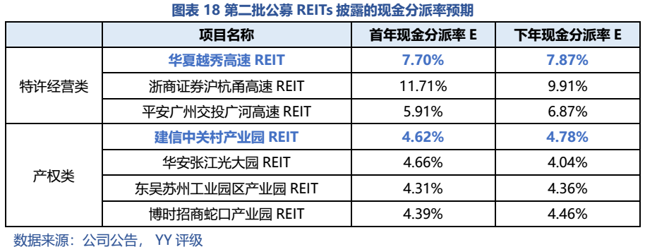 第二批公募REIT只有兩只:華夏越秀高速REIT和建信中關村REIT,整體看底層資產優秀,建信中關村REIT的現金流分派率處于園區類前列。第二批公募REITs認購“火爆”,網下和網上的配售率均不足3%;上市前幾日溢價率最高達38%、40%,之后企穩,但收益率仍高于REITs同類的其他產品。整體看,受益于底層資產的優質、現金分派率較高(建信中關村REIT)以及投資者情緒的高漲,第二批REITs表現亮眼。