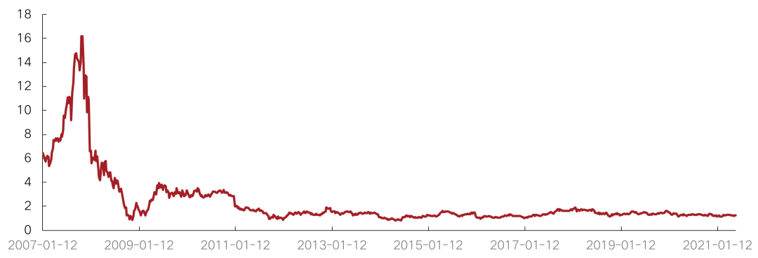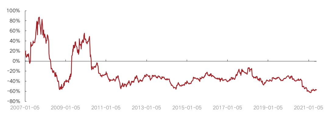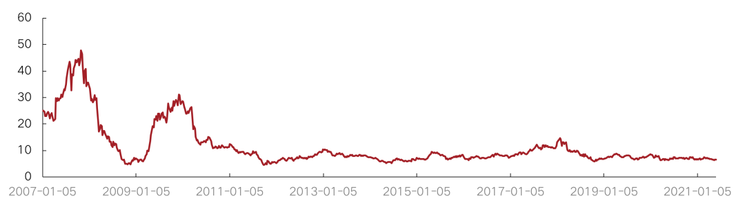 市凈率方面,克而瑞領先股指成分股相對恒指成分股5月較4月有所回落。5月相對恒指PB周均值為61.4% ,低于上月的周均值62.3%,低于2020年全年相對恒指PB周均值75.7%。恒指成分股5月整體PB均值為0.76,低于與上月周均值0.78,高于2020年全年PB周均值0.74。