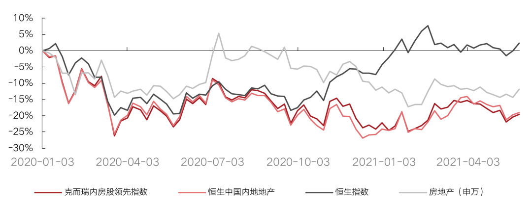 整體來看,自2020年1月1日至今,克而瑞內房股領先指數跌幅19.5%,同期恒生中國內地地產指數跌幅19.0%。恒生指數漲幅2.4%,房地產(申萬)板塊跌幅11.8%。2021年5月,恒生指數上升1.5%,克而瑞內房股領先指數下降0.9%,恒生中國內地地產指數下降2.2%,房地產(申萬)板塊上升1.8%。