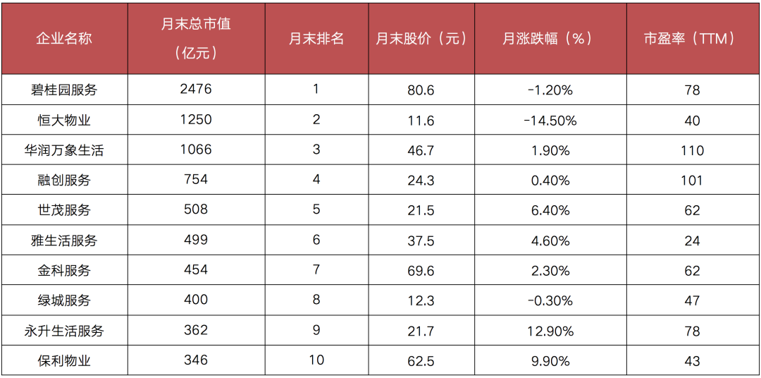 表:5月末物業股市值排行TOP10及漲幅情況