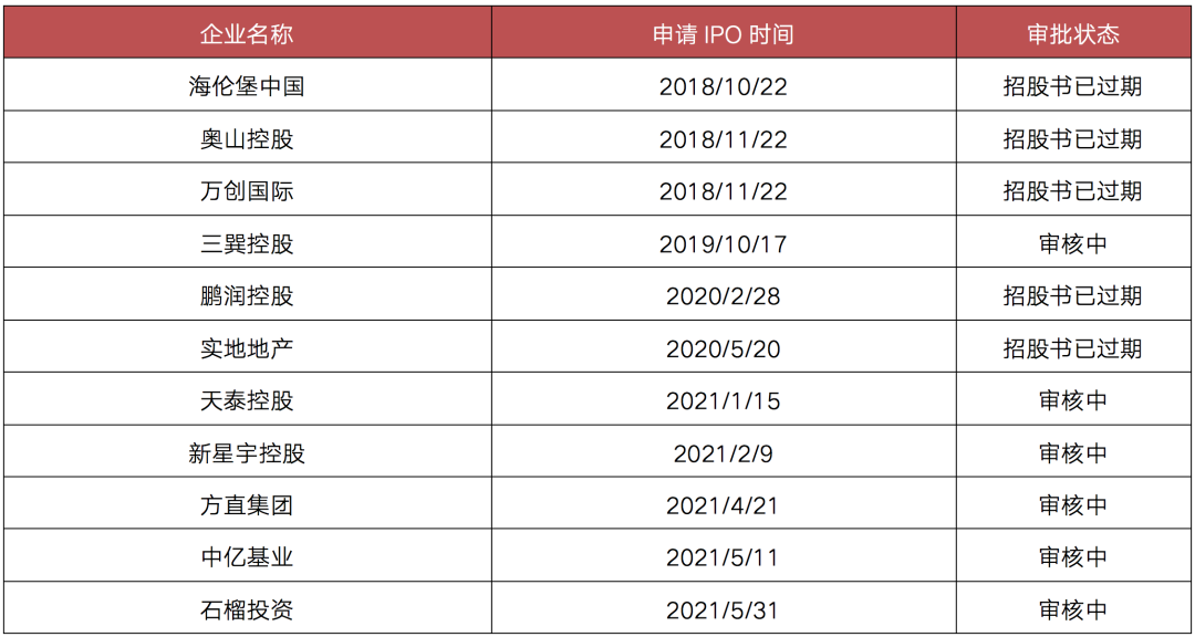 截至2021年5月31日,在港交所遞交招股書但仍未上市的房企共有11家,其中2021年以來共有5家房企房企遞交招股書。值得注意的是,2021年之前遞交上市申請的企業中僅有三巽控股更新過招股書,其余企業均顯示“招股書已過期”。