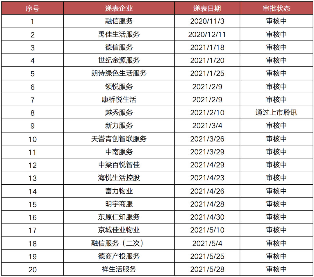 在分拆物業公司上市方面似乎更為順利,5月多家房企分拆旗下物業公司赴港上市,包括北京城建、德商以及祥生,并且有新希望服務1家物企在5月完成上市。截至5月31日,在港交所遞交招股書仍未上市的物業企業共有20家,其中越秀服務已通過上市聆訊,融信服務則兩次遞表。
