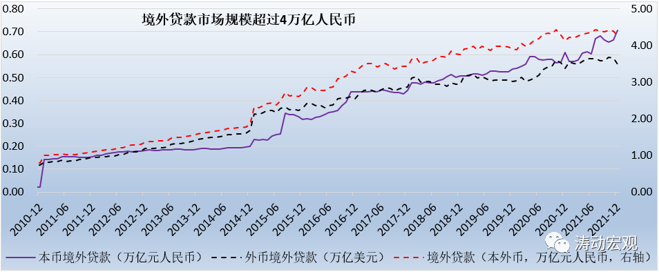 截至2021年底,金融機構的本外幣境外貸款余額達到4.26萬億元人民幣,占全部本外幣貸款的比例只有2.20%,可以看出市場空間實際上還未完全打開。同時我們看到,4.26萬億的本外幣境外貸款中,本幣境外貸款余額只有0.70萬億,占比僅有16.55%,也即83.45%的本外幣貸款由外幣貸款構成(余額達到0.56萬億美元),因此相較而言,我們認為本幣境外貸款的市場空間需要進一步打開。