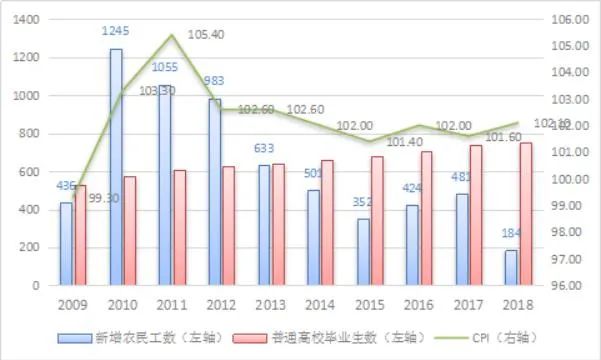 圖2.新增農民工數、普通高校畢業生數及CPI(單位:萬人)