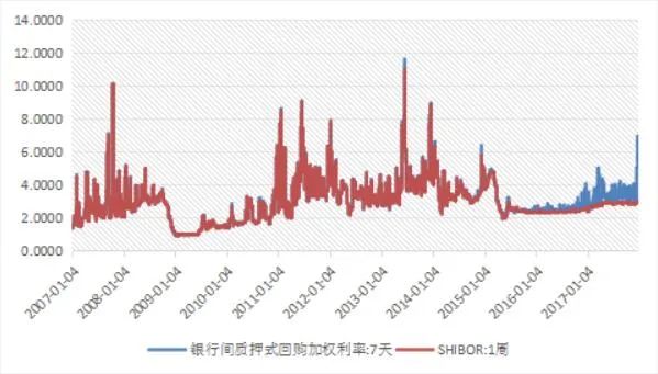 圖4.2007-2017年7天回購利率及SHIBOR1周