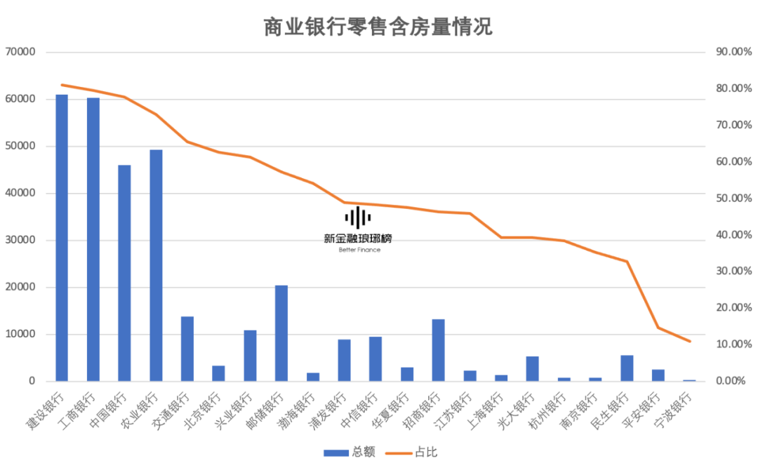整體上,我國(guó)主要商業(yè)銀行的零售含房量為30%-80%,中位數(shù)在50%左右;越是大銀行越高,達(dá)到60%-80%。