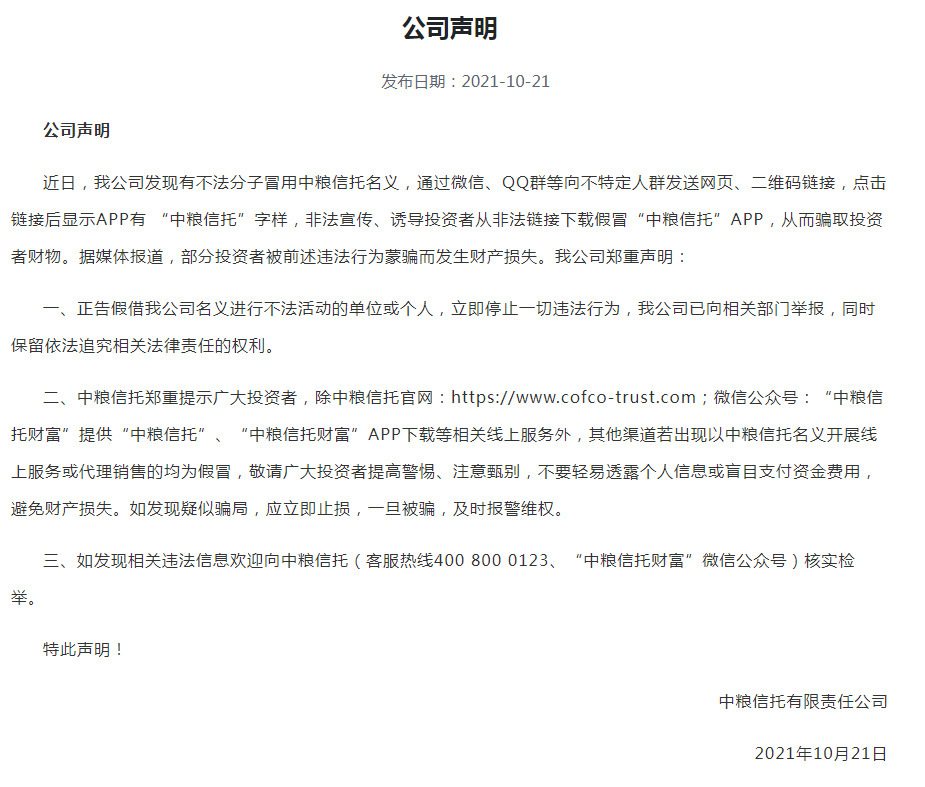 于是乎,在10月21日,中糧信托在官網發表了嚴正聲明。