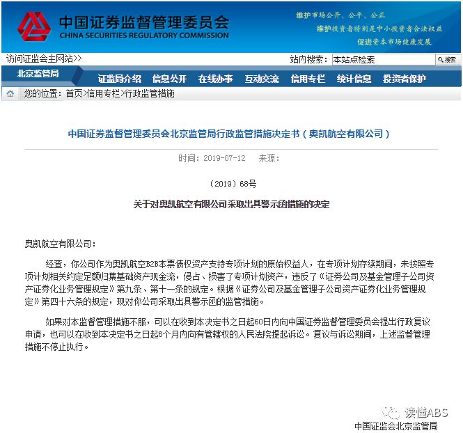 原標題: 北京證監局對奧凱航空出具ABS警示函,未足額歸集現金流,侵占損害專項計劃資產!