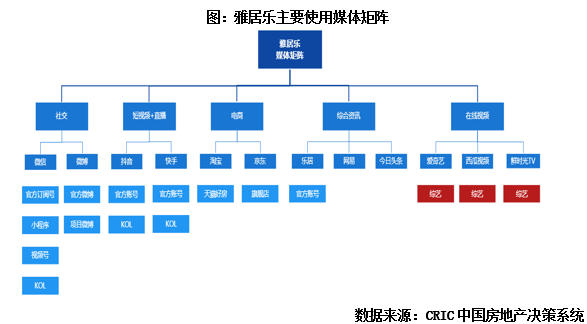 從CRIC監(jiān)測情況來看,目前雅居樂的媒體矩陣中,橫向矩陣基本覆蓋了各年齡段經(jīng)常使用的平臺,在社交、短視頻、直播、綜合資訊等平臺均有布局,由于雅居樂跨界綜藝的創(chuàng)新營銷方式,因此媒體矩陣中還包括鮮有房企進駐的在線視頻平臺,這也是雅居樂媒體矩陣的特色之一;縱向矩陣中微信布局較為全面,處于行業(yè)內中等偏上水平。