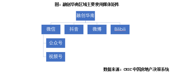 融創(chuàng)華南區(qū)域來看,基于數(shù)字化營銷數(shù)據(jù)沉淀,融創(chuàng)華南區(qū)域積極構建新媒體矩陣,對抖音、微信等產(chǎn)品進行數(shù)據(jù)打通,線上營銷形成閉環(huán)。首先是搭建媒體矩陣:融創(chuàng)華南區(qū)域利用三大新媒體平臺實現(xiàn)四條流量入口,即微信公眾號、微信視頻號、抖音和微博,另外融創(chuàng)華南也開設B站,面向年輕人主打微綜藝。