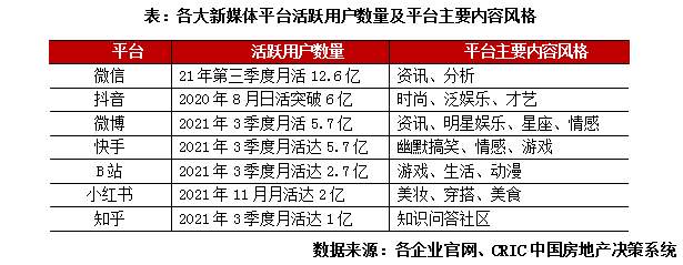 在平臺選擇上,我們建議企業(yè)優(yōu)先布局微信和抖音、快手這類大流量平臺。微信是國人不可或缺的社交工具,月度活躍人數(shù)達到12.6億,并且微信平臺公眾號、小程序、視頻號等架構完善,因此企業(yè)需要重點關注。短視頻平臺近兩年崛起,體量迅速增長,并且短視頻的形式給了企業(yè)更多的創(chuàng)作空間,也是企業(yè)必須要重視的一環(huán)。bilibili、小紅書以及知乎的用戶特征比較明顯,并且更加年輕化,房企也可以積極嘗試。另外還需要關注電商平臺的矩陣搭建,借助電商平臺流量幫助線上售樓推廣。