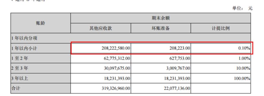 同期,公司營收也在增長,應收賬款和存貨增加有一定的合理性。問題在于公司壞賬準備的計提比例較低,一年以內的應收款計提比例僅為0.1%.