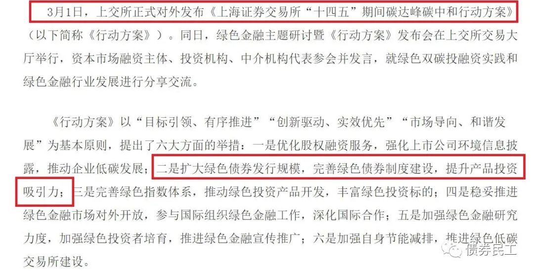 上海證券交易所發布《上海證券交易所“十四五”期間碳達峰碳中和行動方案》,明確提出要“擴大綠色債券發行規模,完善綠色債券制度建設,提升產品投資吸引力”