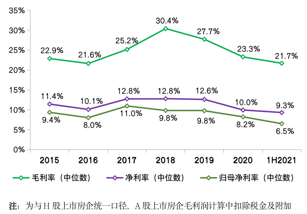 CRIC數(shù)據(jù)顯示,今年上半年80家典型上市房企毛利率中位數(shù)僅為21.7%,同比降低1.6個(gè)百分點(diǎn)。凈利率和歸母凈利率中位數(shù)分別降低0.6和1.7個(gè)百分點(diǎn)至9.3%和6.5%。三大核心指標(biāo)均呈現(xiàn)下行趨勢(shì),上半年降幅較2020年進(jìn)一步擴(kuò)大。