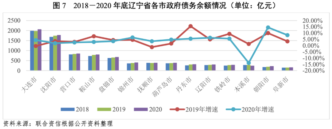 償債能力方面,截至2020年底,除大連市和葫蘆島市政府債務率有所上升,其他市均有所下降,其中本溪市下降較多。從絕對值看,2020年底,除朝陽市外,遼寧省其余各市政府債務率均高于60%。其中,營口市、盤錦市和鞍山市政府債務率位居省內前三位,均高于200%;撫順市、大連市、葫蘆島市、遼陽市和錦州市政府債務率在120%~200%之間,本溪市、丹東市、鐵嶺市和沈陽市政府債務率在80%~120%之間,其余各州市政府債務率均在80%以下。