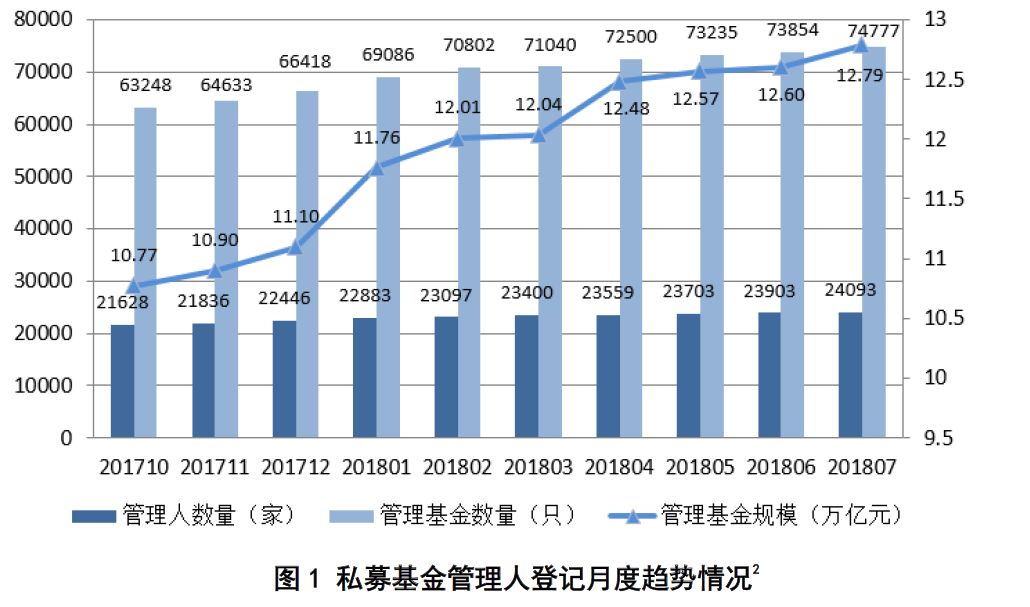 根據中基協的私募基金月報,截至2018年7月底,私募基金總規模為12.79萬億元。