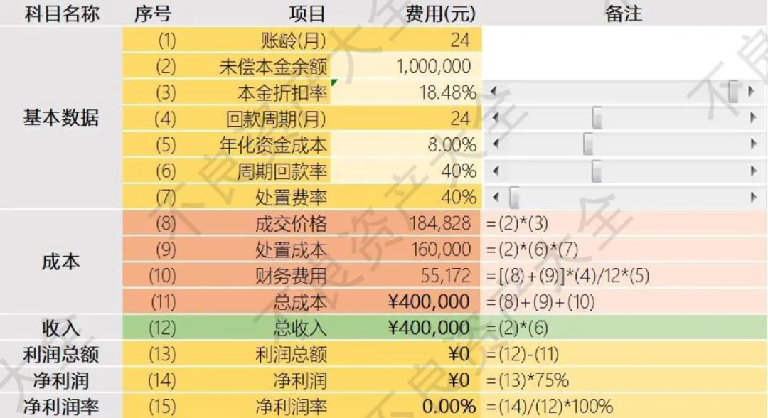 如上圖表,以未償本金余額100萬的銀行個貸不良資產為例,在假設條件下,理想狀態達到盈虧分界點的個貸不良資產價格約為18.48%.也即,當銀行個貸不良資產成交本金折扣率小于18.48%時,該不良資產按假設條件處置可以盈利,反之反是。