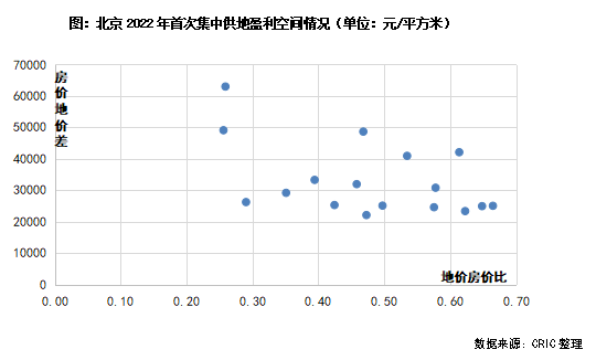 反之北京城建競得的豐臺區(qū)[2022]003號地塊,成交樓板價(jià)為22008元/平方米,銷售指導(dǎo)價(jià)達(dá)到88000元/平方米,地價(jià)房價(jià)比僅有0.26,房價(jià)與地價(jià)的差值更是在6萬元/平方米以上。但地塊存在5.4萬平方米的產(chǎn)業(yè)用地,且有9800平方米的保障房,運(yùn)營的復(fù)雜系數(shù)較高,因此最終仍是底價(jià)成交。