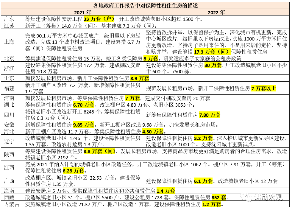 (三)多地在政府工作報告中提出了2022年保障性租賃住房建設的具體任務,如廣東33萬套、浙江30萬套、上海17.30萬套、江蘇14.80萬套、安徽9.85萬套、山東8.90萬套、陜西8.80萬套、北京8萬套、四川7.80萬套、福建與河南均為7萬套、湖北6.70萬套、廣西6.10萬套等。