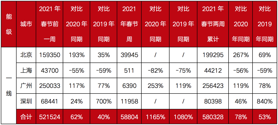 一線城市在春節(jié)期間表現(xiàn)可圈可點,2021年春節(jié)兩周成交量增幅較2020年和2019年同期均大幅上漲50%以上。