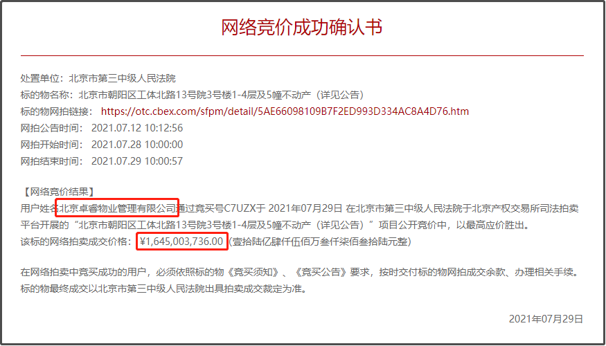 據(jù)北京交易產(chǎn)權(quán)網(wǎng)顯示,北京市朝陽區(qū)工體北路13號院3號樓1-4層及5幢不動產(chǎn)于2021年07月28日10時(shí)開始網(wǎng)拍,在經(jīng)歷24小時(shí)后,于2021年07月29日10時(shí)左右被北京卓睿物業(yè)管理有限公司以16.45億元的價(jià)格成功拍下。