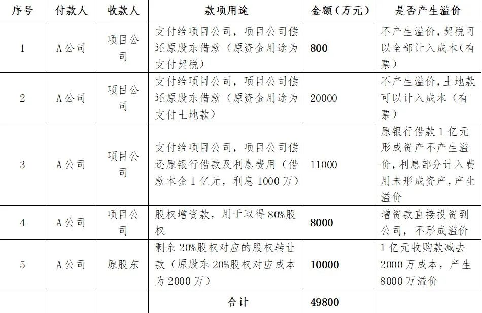 A公司先增資8000萬元進(jìn)入某項(xiàng)目公司,取得該公司80%股權(quán),后續(xù)又通過股轉(zhuǎn)方式取得剩余20%股權(quán),股權(quán)轉(zhuǎn)讓價(jià)格10000萬元。具體支付款項(xiàng)見下述明細(xì)表: