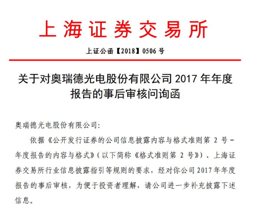 上交所也于2018年5月14日對奧瑞德下發了問詢函,針對公司分季度數據異常、應收賬款及關聯方欠款、業績承諾及補償、債務風險等方面進行了問詢。