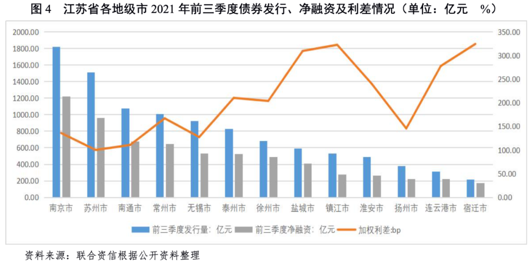 江蘇省城投債發行及存續規模大,主要集中于蘇南地區,南京市新發及存續規模最大,宿遷市最小;存續債券信用等級整體以高等級為主,蘇南地區存續城投債信用等級整體高于蘇中及蘇北地區,徐州、揚州及宿遷市存續債以AA級為主;存續債券行政層級以較低的區縣及園區級為主,蘇南地區存續城投債行政層級下沉程度整體大于蘇中及蘇北地區。蘇南地區城投債發行成本優勢明顯好于蘇北地區,宿遷市、鎮江市和鹽城市發債成本省內相對較高。2021年前三季度,江蘇省各地市債券凈融資規模均為正,宿遷市、連云港市和揚州市債券凈流入規模偏低。