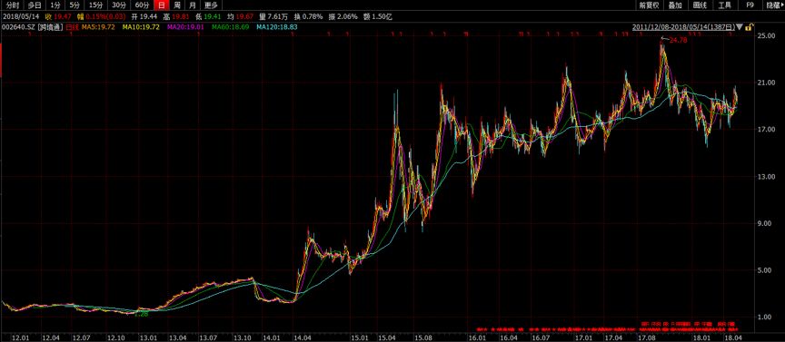 這一系列并購拉動了公司業(yè)績的持續(xù)上升,自2014至2017年,公司歸母凈利潤由0.33億元增至7.51億元,累計增幅達到2175.76%。而隨著業(yè)績增長,公司的股價也是一路上揚。