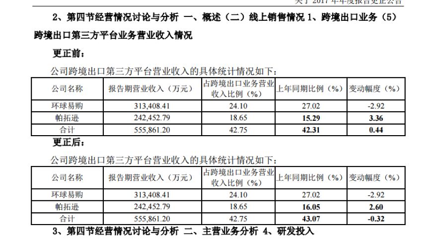 對比兩份報告發(fā)現(xiàn),公司對原財報關(guān)于經(jīng)營情況討論與分析、合并利潤表和重要會計政策及會計估計中的存貨跌價準備政策三個部分中合計5處內(nèi)容進行了更正。更正的內(nèi)容主要涉及公司各跨境出口平臺收入占營收比例、研發(fā)投入變動比例等。簡單截幾張圖感受下: