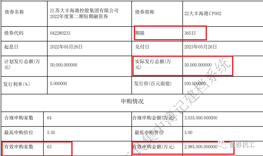 2022年5月25日,江蘇大豐海港控股集團有限公司(以下簡稱“大豐控股”)發行2022年度第二期短期融資券,發行金額為5億元,有效申購金額為298.50億元,申購倍數高達59.7倍!!!這個申購倍數,是債券民工見過的最高的,之前只見過10倍的。“22大豐海港CP002”的債券期限為1年,最終發行利率為5.0%。