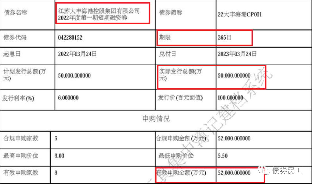 1、縱向對比來看,就在兩個月前,大豐控股于3月22發行了“22大豐海港CP001”,發行規模也是5億元,全場倍數只有1.04倍,發行利率為6%,債券期限為1年。這個發行結果符合市場的預期,沒有引起任何的關注。從公開披露的信息來看,在在“22大豐海港CP001”發行之后的兩個月內,大豐控股主體信用沒有發生變化,未披露任何重大臨時事項。然而就在這平平無奇的兩個月內,大豐控股實現了大逆轉,申購倍數從1.04倍飆升至59.7倍。