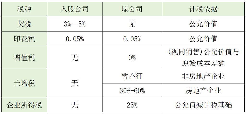 從表來看,在投資新設模式下,新設的公司需承擔0.05%的印花稅,和3%~5%的契稅,計稅依據為投入資產的公允價值。