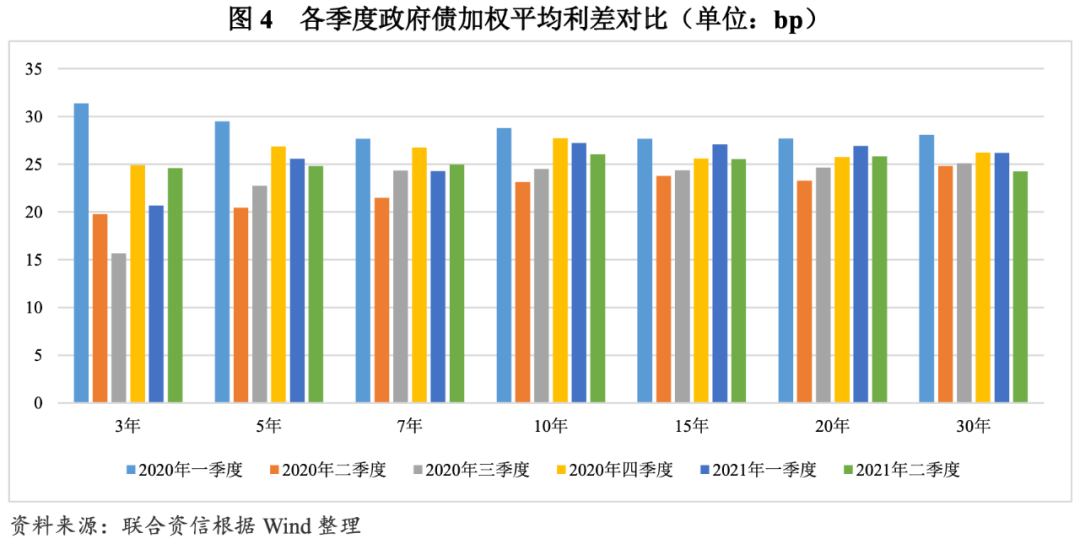 發行利差走勢有所分化,中長期品種的區域利差有所擴大。發行利差方面,以同期限中債國債到期收益率為基準,2021年一季度,10年及以下期限政府債券加權平均利差環比均有所下降,15年及以上期限政府債券加權平均利差環比有所上升或保持相對穩定;2021年二季度,除3年和7年政府債券外,其他期限政府債券加權平均利差環比均有所下降。分區域看,2020年以來,青海省和內蒙古自治區發行的中長期品種利差顯著高于其他區域;一季度,區域分化較上年度明顯走闊;二季度,中長期品種的區域利差有所收斂。與2020年相比,有近一半省(市、自治區)2021年二季度政府債券發行利差有所下降,其中天津市、重慶市和河北省發行利差降幅均超過4bp,天津市最高為7.95bp;黑龍江省、內蒙古自治區、遼寧省、甘肅省和青海省發行利差增幅超過3bp。
