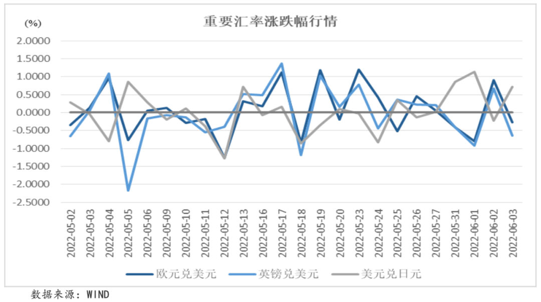 本周,歐元區(qū)5月通脹率創(chuàng)下歷史新高,引發(fā)市場(chǎng)對(duì)于歐洲央行7月加息的預(yù)期進(jìn)一步走強(qiáng),對(duì)歐元形成一定支撐,但美元走強(qiáng)仍對(duì)歐元造成很大壓力,本周歐元兌美元收于1.0718,周內(nèi)累計(jì)收跌0.56%。本周,大量保守黨議員就“派對(duì)門”事件對(duì)英國(guó)總理鮑里斯進(jìn)行批判,或?qū)⒁l(fā)不信任投票,再加上英國(guó)與歐盟在北愛(ài)爾蘭協(xié)議問(wèn)題上的爭(zhēng)論也在逐步升級(jí),導(dǎo)致北愛(ài)爾蘭獨(dú)立勢(shì)力也有所活躍,事態(tài)恐進(jìn)一步惡化,英鎊因此承壓,本周英鎊兌美元收于1.2490,周內(nèi)累計(jì)收跌1.29%。本周,隨著美聯(lián)儲(chǔ)開啟“縮表”進(jìn)程,日美貨幣政策走勢(shì)的進(jìn)一步分化打壓了日元的表現(xiàn),大宗商品價(jià)格的上漲也對(duì)日本進(jìn)口帶來(lái)壓力,美元兌日元收于130.8245,周內(nèi)累計(jì)收漲2.54%,時(shí)隔兩周再次突破130大關(guān)。