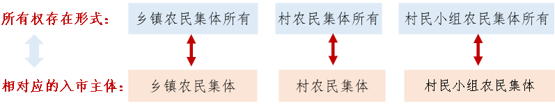 根據(jù)相關法律法規(guī)所確立的原則,允許其首次入市的法定主體為集體經(jīng)營性建設用地的所有權人。而再次入市的,允許的入市主體即為已經(jīng)取得集體經(jīng)營性建設用地使用權的使用權人。回溯集體經(jīng)營性建設用地的所有權與入市主體的匹配形式, 主要存在三種情形,分別如下對應所示:
