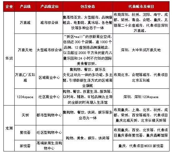 產品線定位方面,華潤的產品覆蓋城市綜合體、區域商業中心和社區商業中心,而龍湖的產品定位于都市購物、社區商業等