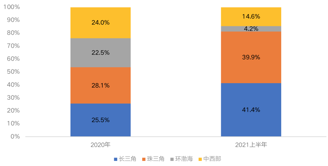 圖:萬科2020年及2021年上半年各區(qū)投資占比情況(剔除22城)