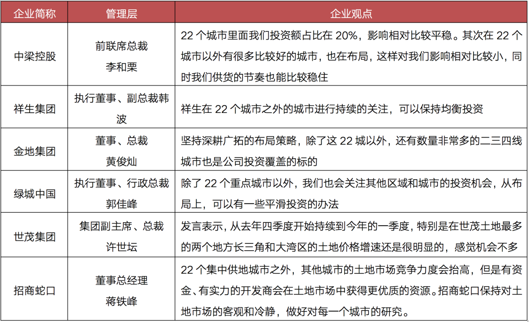在人們紛紛把目光放在集中供地的22城之時,我們發(fā)現(xiàn),除了這22城之外,房企的投資也出現(xiàn)了一定的變化,如中梁、祥生、金地、綠城表示要尋求22城之外投資機會,招商蛇口、世茂直言部分熱點區(qū)域土地價格被抬高。