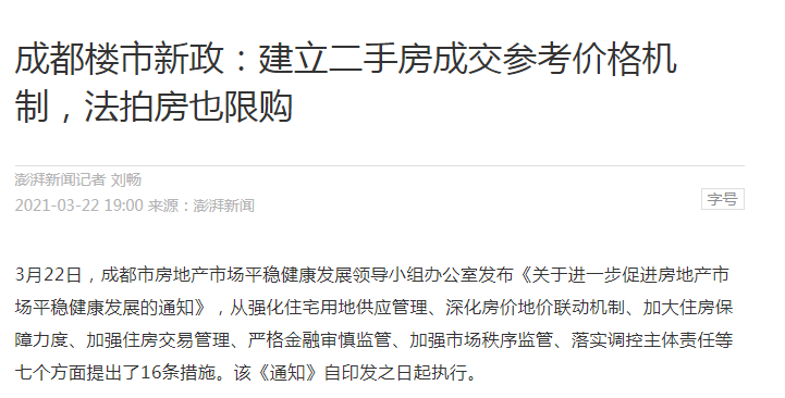 3月22日,成都市房地產(chǎn)市場(chǎng)平穩(wěn)健康發(fā)展領(lǐng)導(dǎo)小組辦公室發(fā)布《關(guān)于進(jìn)一步促進(jìn)房地產(chǎn)市場(chǎng)平穩(wěn)健康發(fā)展的通知》,其中提到了建立二手房成交參考價(jià)格機(jī)制,并將法拍房也納入限購(gòu)范疇。