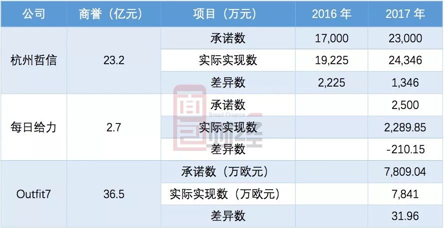 此外,形成商譽最大的Outfit7,2017年業績也是壓線完成。Outfit7公司2017年度實現扣非后歸母凈利潤7841萬歐元,僅超過承諾數31.96萬歐元。以下為根據公開數據統計的主要幾家子公司業績完成情況: