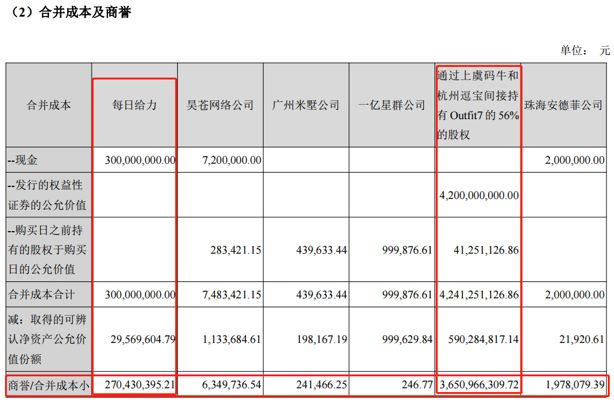其中,通過上虞碼牛和杭州逗寶間接持有Outfit7的56%的股權收購價高達42.41億元,合并形成商譽約36.5億。