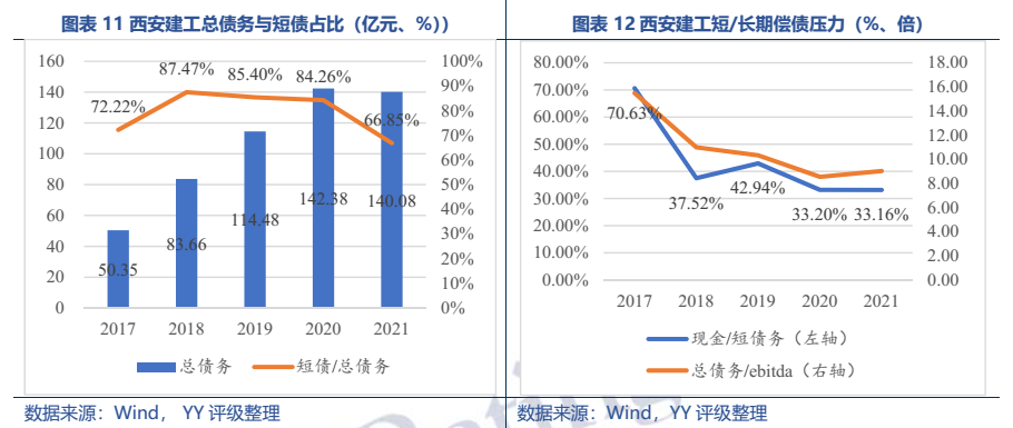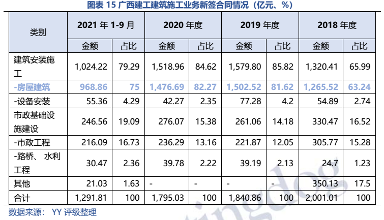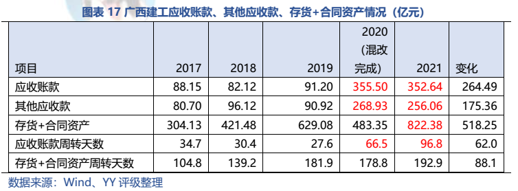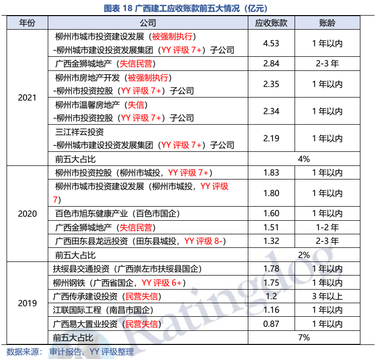 梳理分析下來,可知西安建工混改完成后新簽合同大幅增加,同時,房建占比提升,展業區域由西安市內拓展至西北區域;對綠地風險敞口51億元,其他對手方以民營房企和弱國企為主,資質較弱;綠地展期后,暫無前臺成交,預計后續隱含將明顯弱化。廣西建工混改完成后業務變化不大,仍以房建為主,集中在廣西展業;與綠地資金牽連不大(或未披露),但業務對手方資質弱,以出險房企、失信民營房企和弱城投為主;在年內到期或行權債券約60億元的情況下,綠地展期后隱含急劇弱化,YY隱含飆升至20以上。